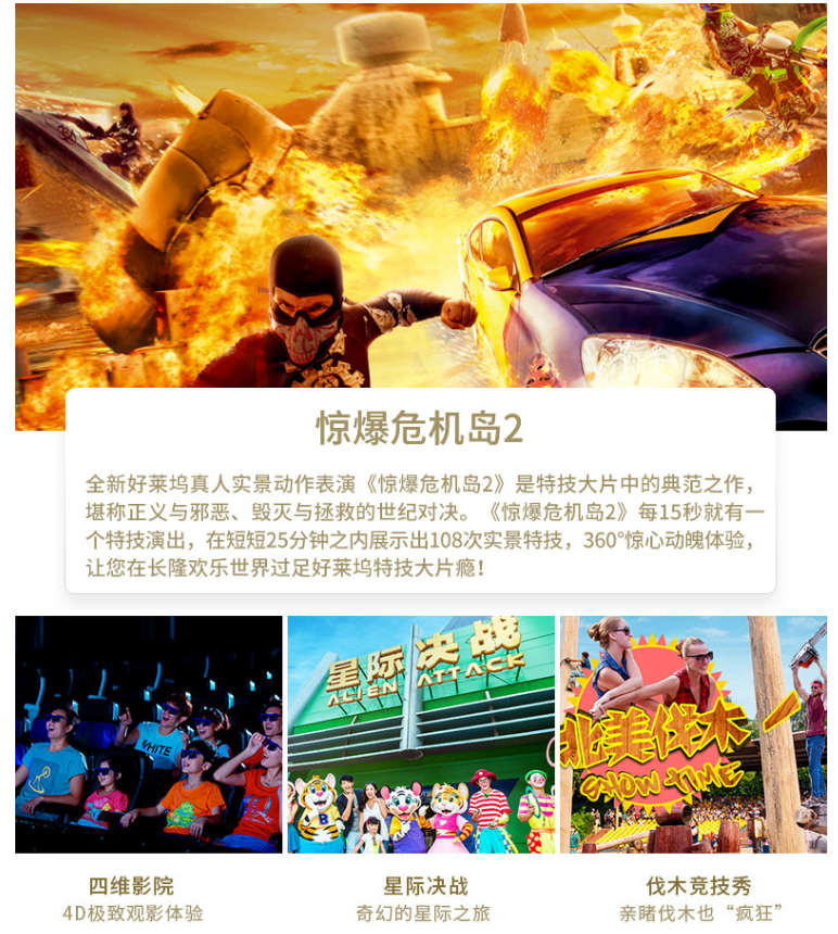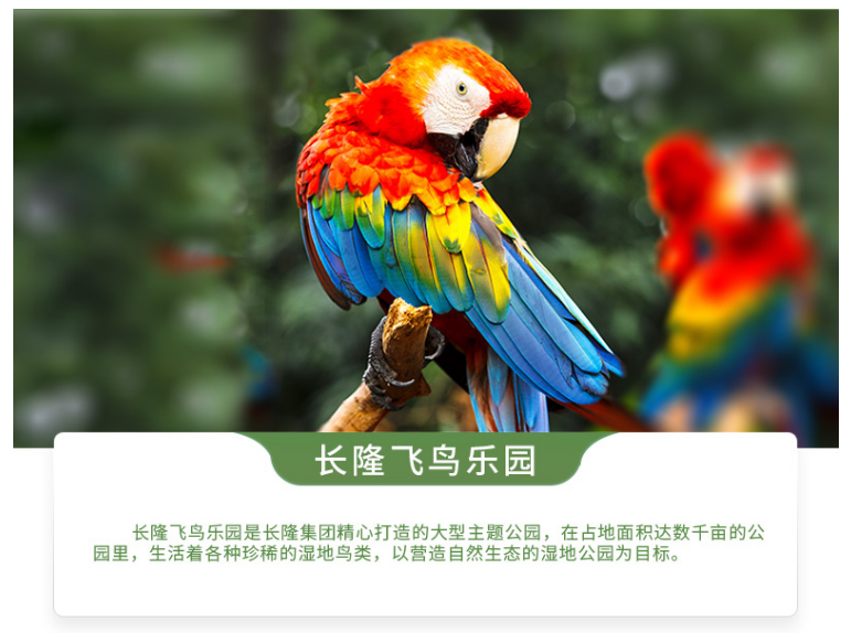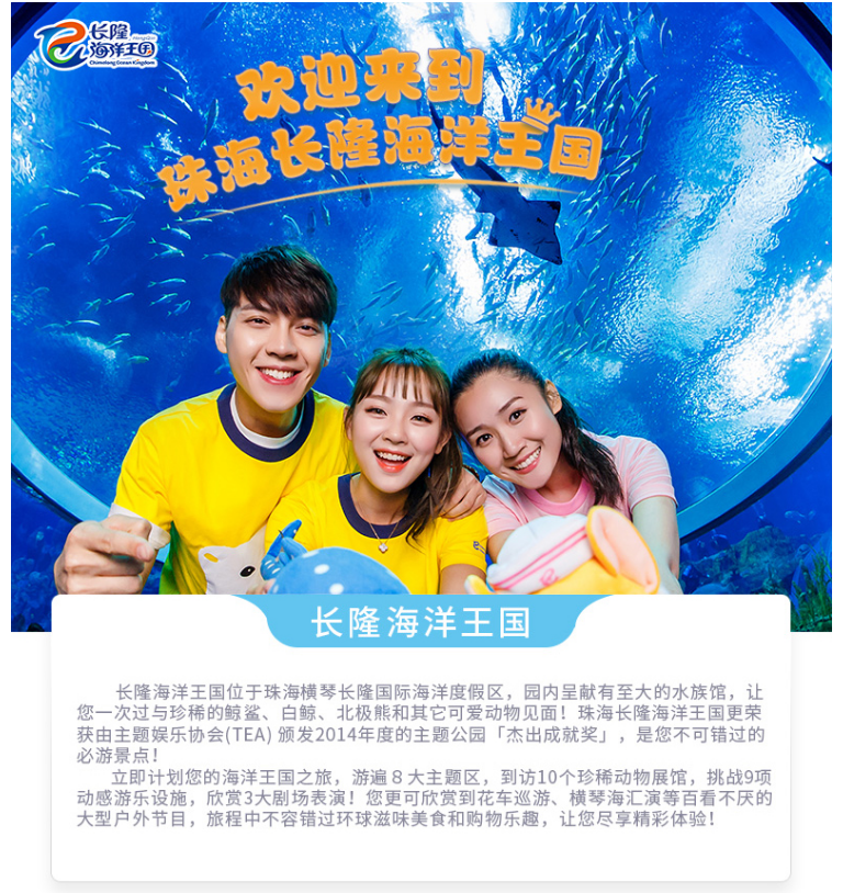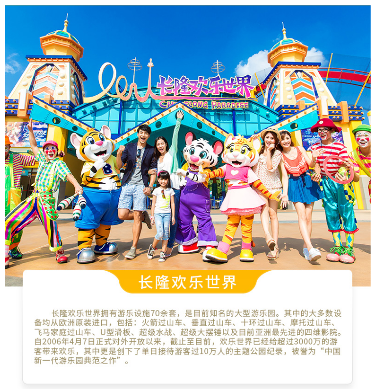广州长隆旅游度假区是长隆集团旗下首个综合性主题旅游度假区,拥有长隆欢乐世界、长隆国际大马戏、长隆水上乐园、长隆野生动物世界、长隆飞鸟乐园和长隆酒店等多家主题公园及酒店,是中国拥有主题公园数量众多和超大规模的综合性主题旅游度假区,先后被评为“文化产业示范基地 ”、“ 科普教育基地 ”、中国首批国家AAAAA 级景区,年接待游客连续多年超过千万人次,位居世界主题景区前列,成为中国在世界旅游业的标杆。