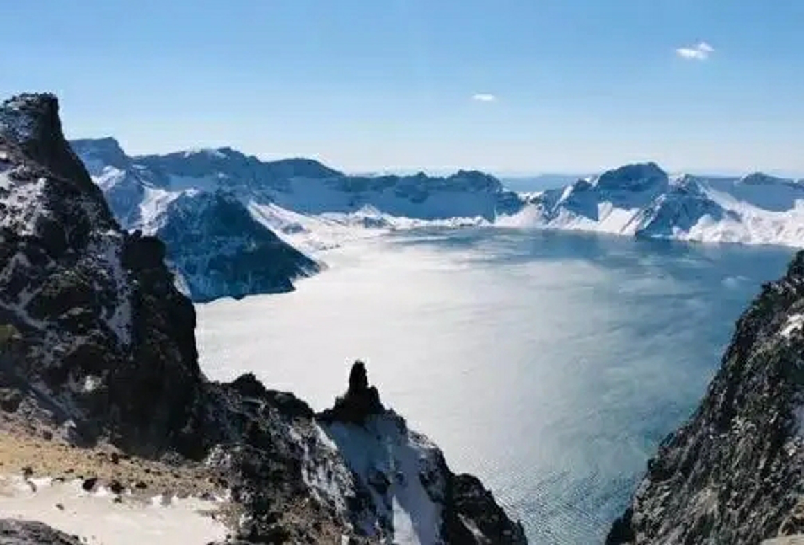 天池清澈幽深,倒映蓝天群峰,很是壮观。